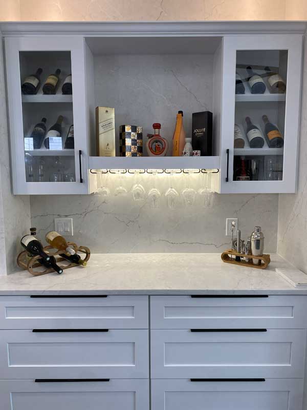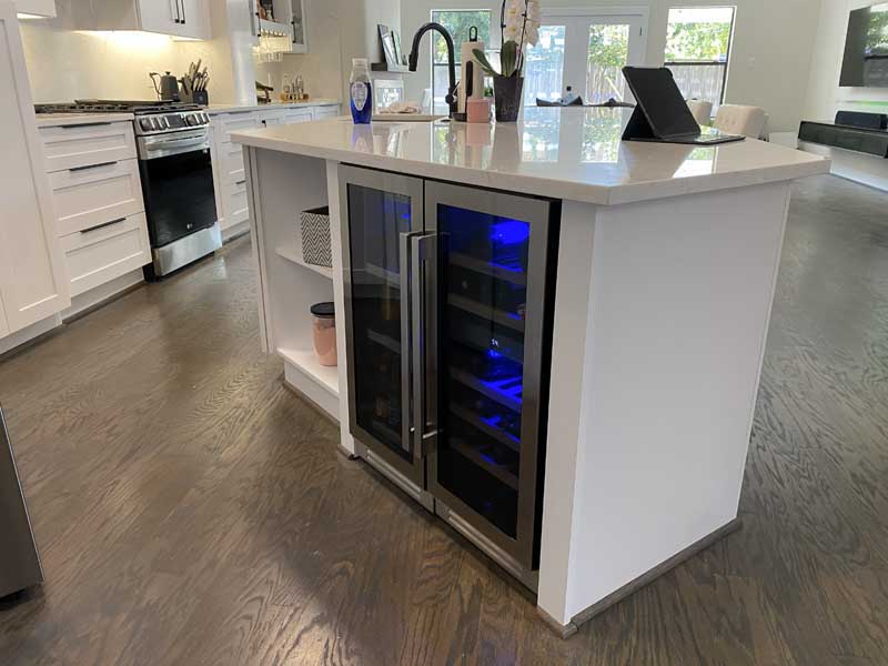 The island includes a built-in wine cooler on the living room side, with 30-bottle capacity, dual-zone temperature control, and LED interior lighting. This replaced the undercounter refrigerator the homeowners initially wanted, which would’ve cost more and provided less functional value. Wine coolers make sense in Houston’s entertaining culture; extra refrigerator space doesn’t when you’ve got a full-size fridge eight feet away.