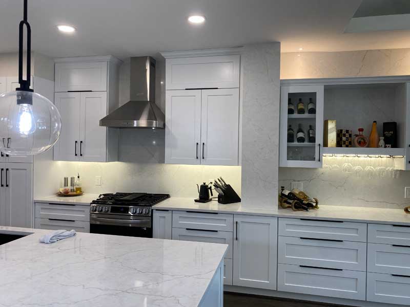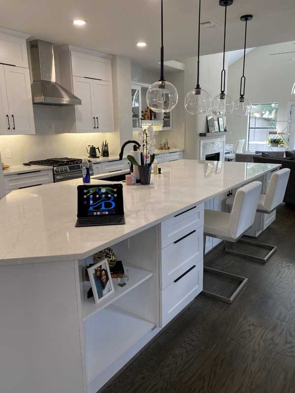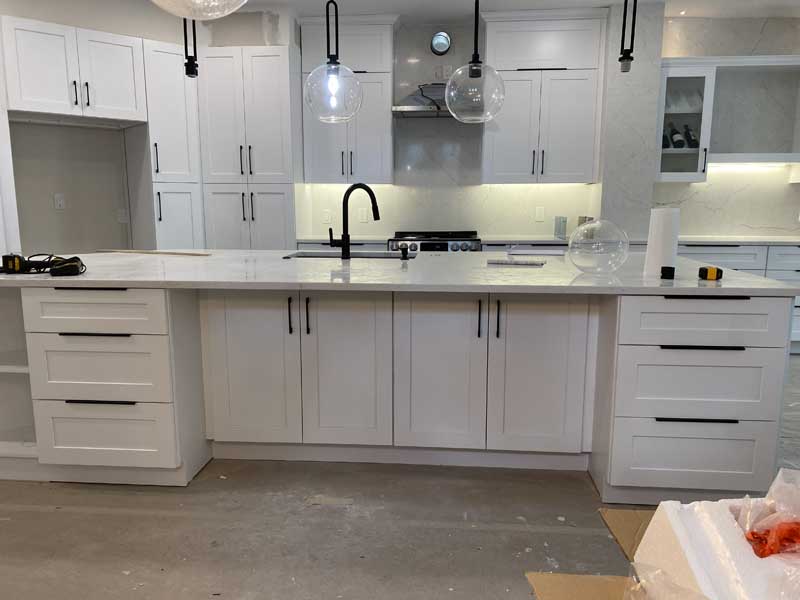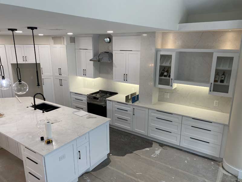 - Week 9: Countertop fabrication and installation, backsplash tile work, and flooring installation.