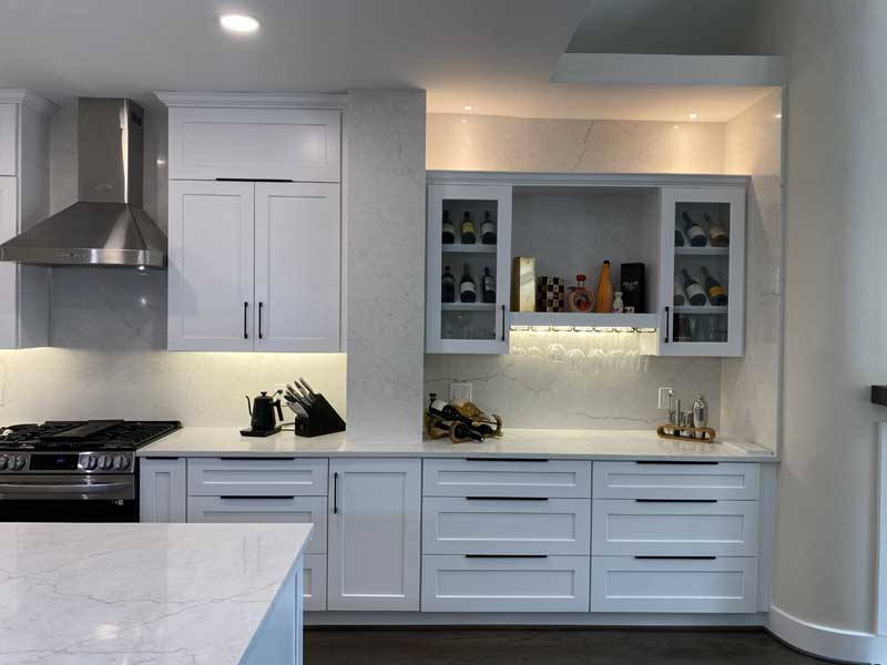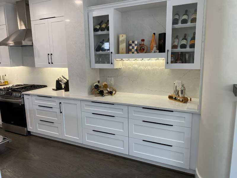 The homeowners initially priced cabinets at Home Depot and Lowe’s. They received quotes of around $18,000 for particleboard boxes with veneer fronts, soft-close hardware that stops working after 2 years, and a 1-year warranty. We connected them with our cabinet partner, a local shop that builds plywood boxes with dovetail joinery, mortise-and-tenon face frames, and full-extension drawer slides rated for 100 pounds.