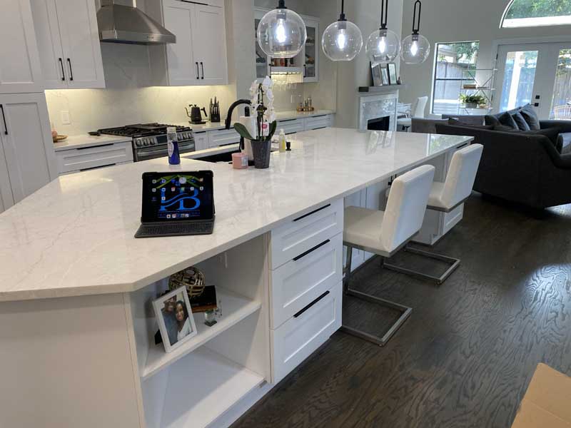 - Week 8: Cabinet installation and countertop templating. Cabinets were installed over three days, followed by digital templating for countertops.