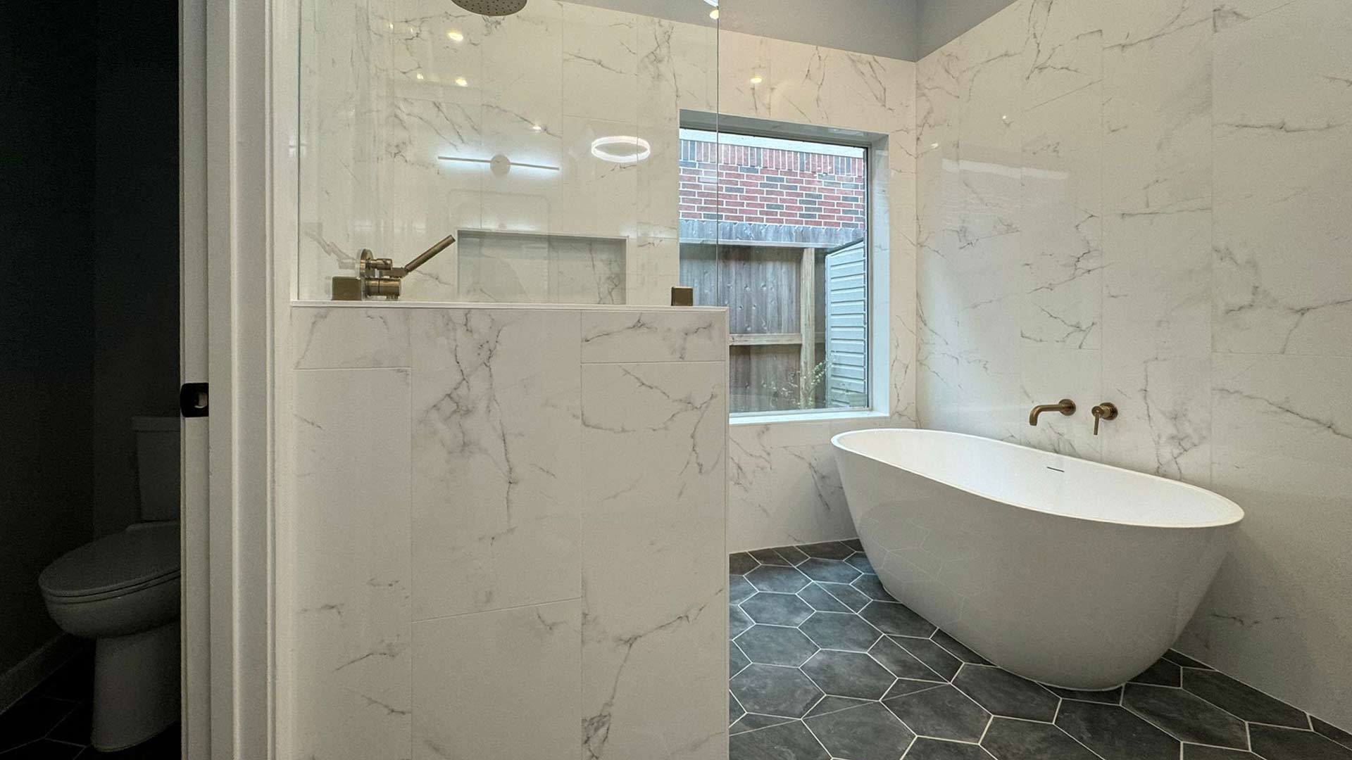 This comprehensive main bathroom renovation spans approximately 150-180 square feet, featuring a complete redesign that eliminates a standard tub-shower combination in favor of separate, luxury bathing experiences. The project features a spacious walk-in shower with a frameless glass enclosure, a sculptural freestanding tub positioned beneath a window for natural light, a custom dual vanity with central tower storage, a separate water closet, and large-format hexagonal floor tiles throughout.