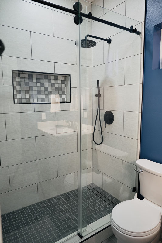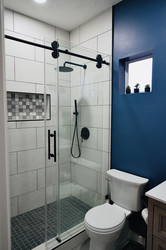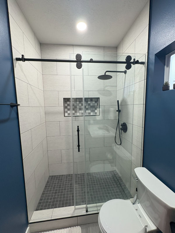 This Houston bathroom renovation transformed a compact 5×8-foot space into a modern sanctuary featuring a walk-in shower with frameless glass, new fixtures, and dramatic navy blue walls. The project demonstrates how strategic design maximizes functionality while delivering contemporary aesthetics within typical Houston mid-range budgets.