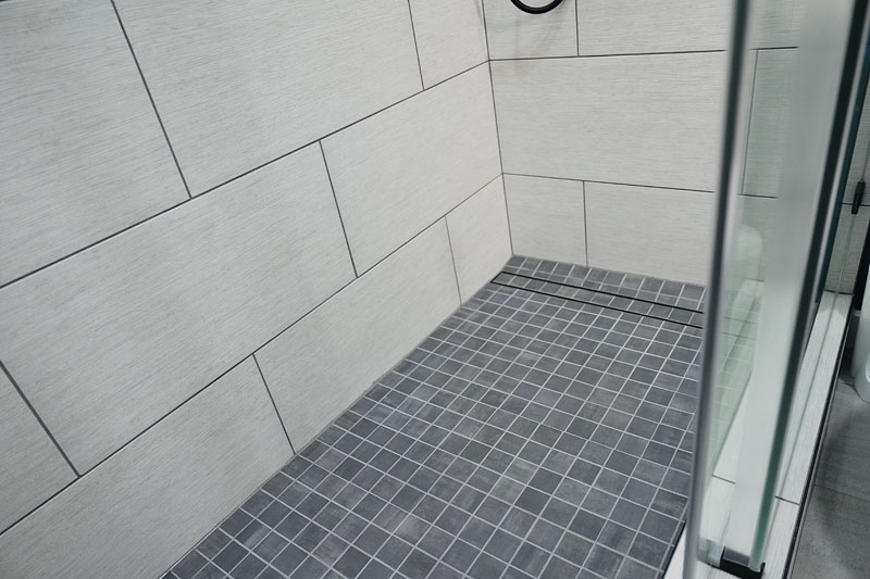 The shower floor features 2×2-inch gray mosaic tiles, providing excellent traction while maintaining a proper 1/4-inch-per-foot slope toward the linear drain. Small-format tiles accommodate the pitch without creating uneven surfaces. A foam shower base system with integrated slope ensures consistent drainage and superior waterproofing.