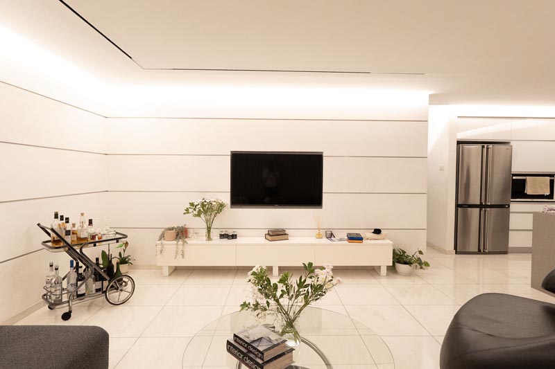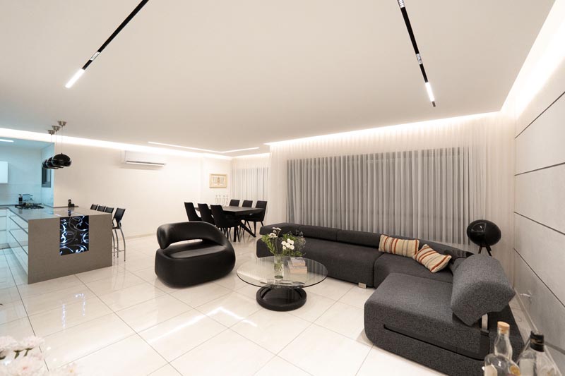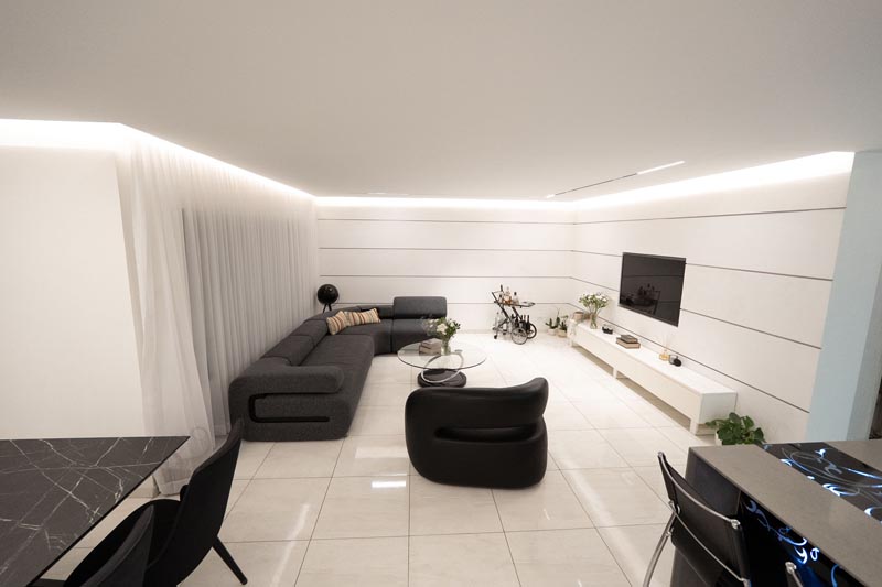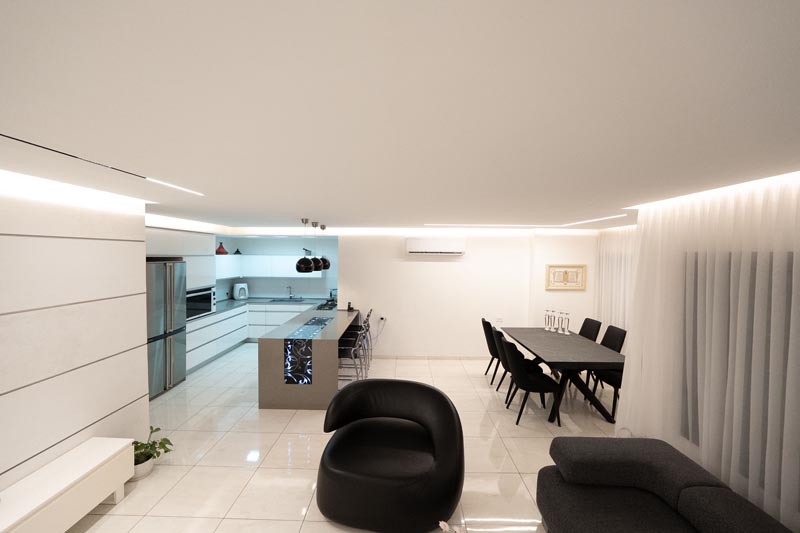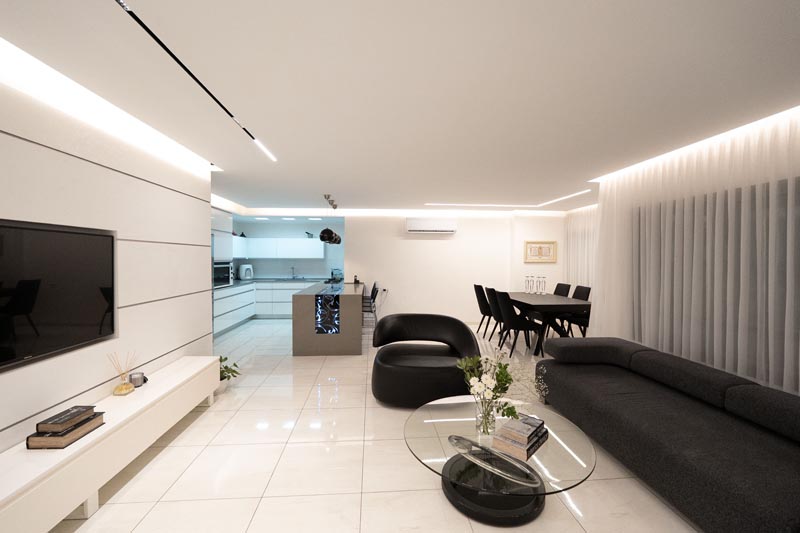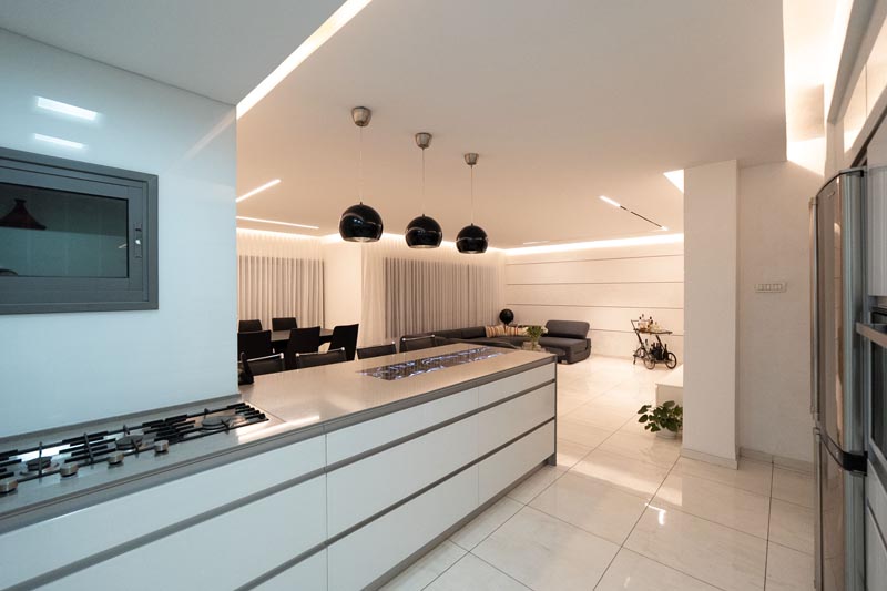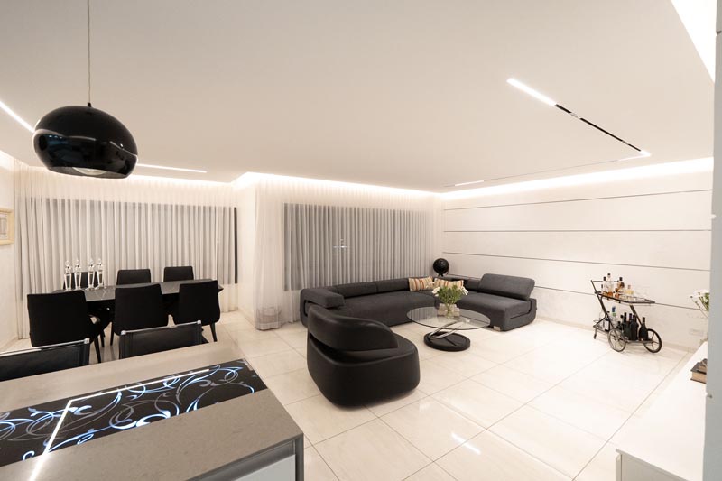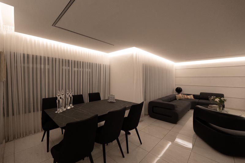 Recessed cove lighting runs along the perimeter of ceilings throughout the living and kitchen areas. This indirect lighting creates a soft, diffused glow that makes ceilings appear to float while providing ambient illumination without harsh shadows or glare. The warm white LED strips used in this installation consume minimal energy while delivering consistent, attractive lighting.