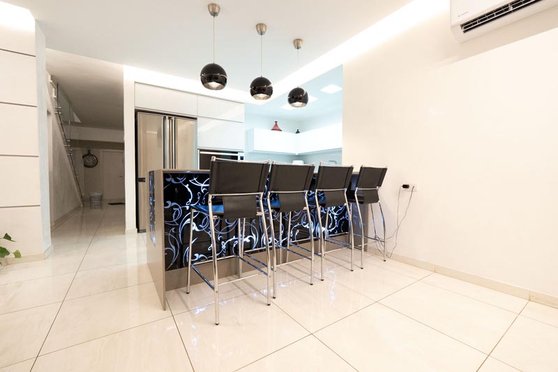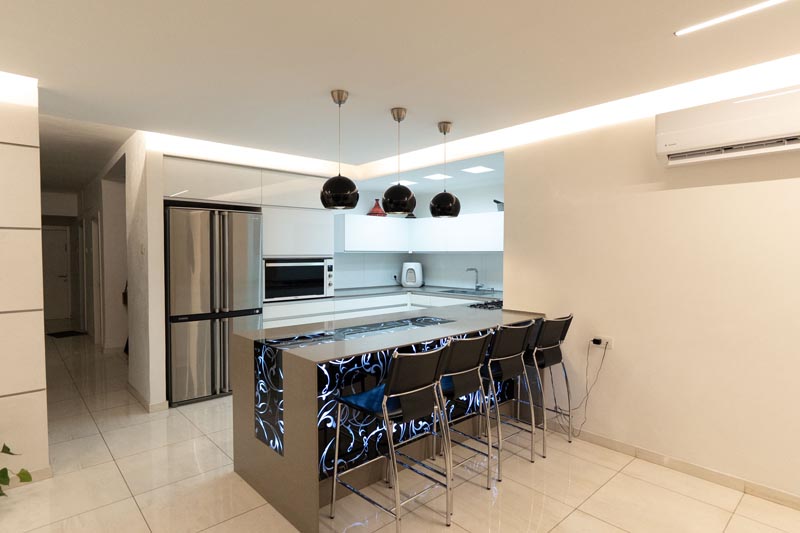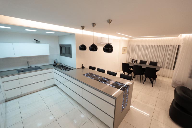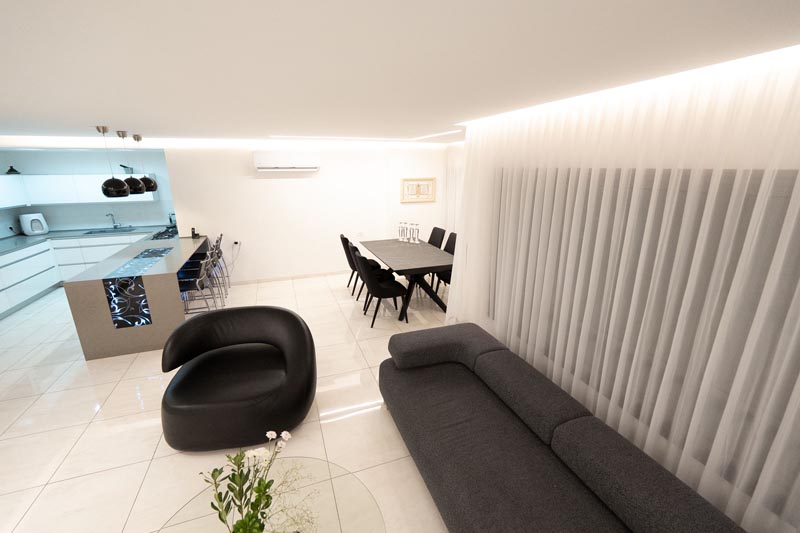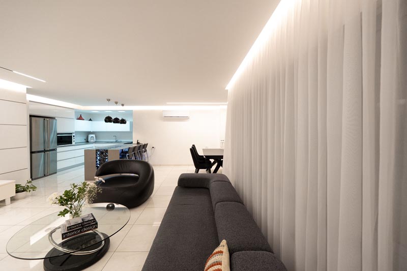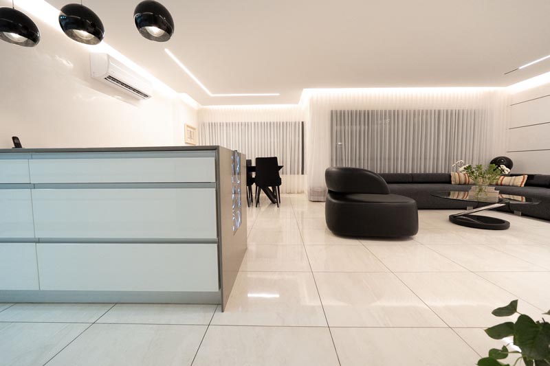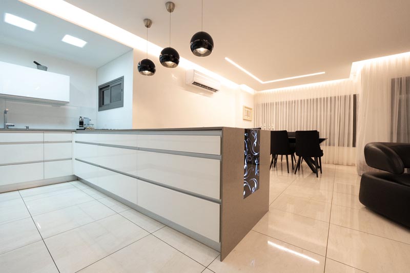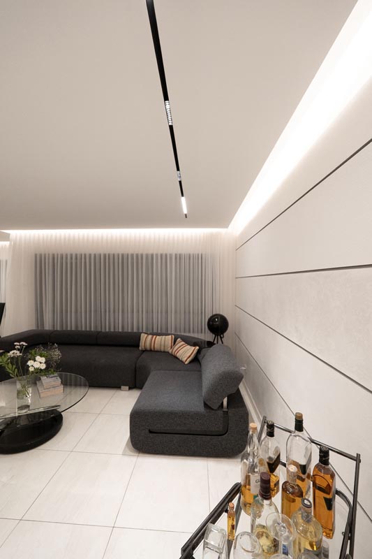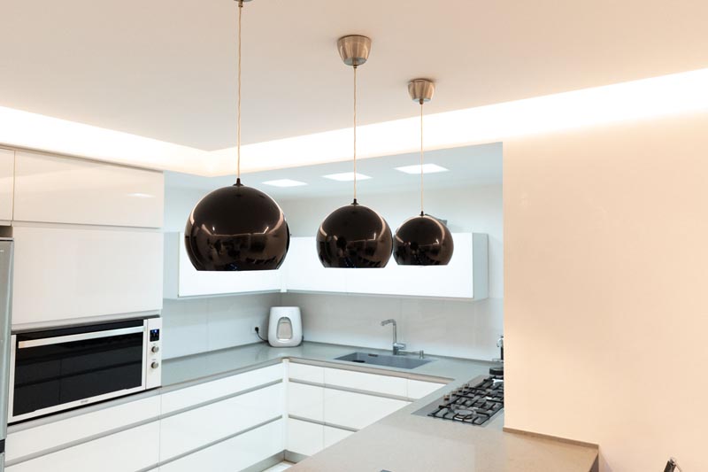 Recessed cove lighting runs along the perimeter of ceilings throughout the living and kitchen areas. This indirect lighting creates a soft, diffused glow that makes ceilings appear to float while providing ambient illumination without harsh shadows or glare. The warm white LED strips used in this installation consume minimal energy while delivering consistent, attractive lighting.