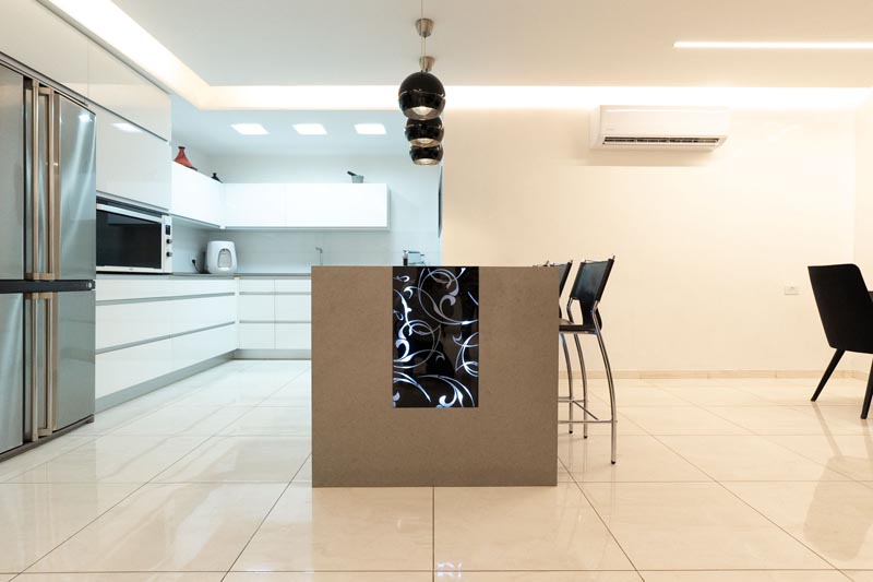 • Visual separation between the kitchen work zone and the living areas