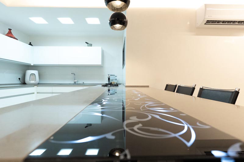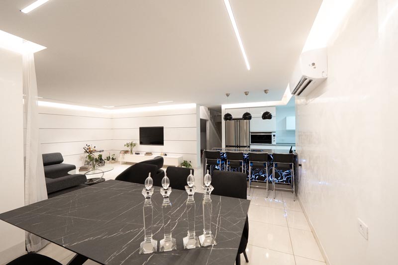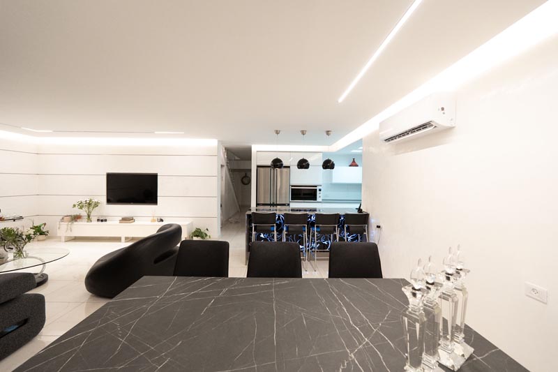 A dedicated dining table, positioned between the then and thenning areas, seats six to eight guests comfortably. The dark-veined marble-look table provides a sophisticated contrast against the light flooring, while offering a sufficient surface area for proper place settings and serving dishes.