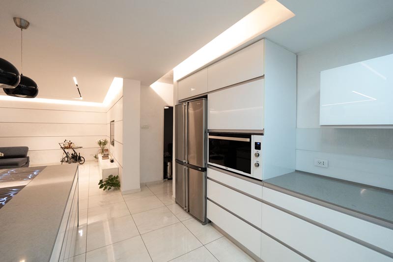 White handleless cabinetry dominates both kitchen and living areas, creating visual continuity while maximizing storage capacity. The push-to-open mechanism eliminates visible hardware, contributing to the minimalist aesthetic while providing convenient access to contents.
