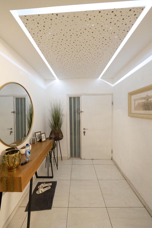 One ceiling area incorporates a perforated acoustic panel bordered by LED lighting. This detail serves dual purposes: improving acoustics in the open space while creating an artistic focal point when viewed from the dining area.