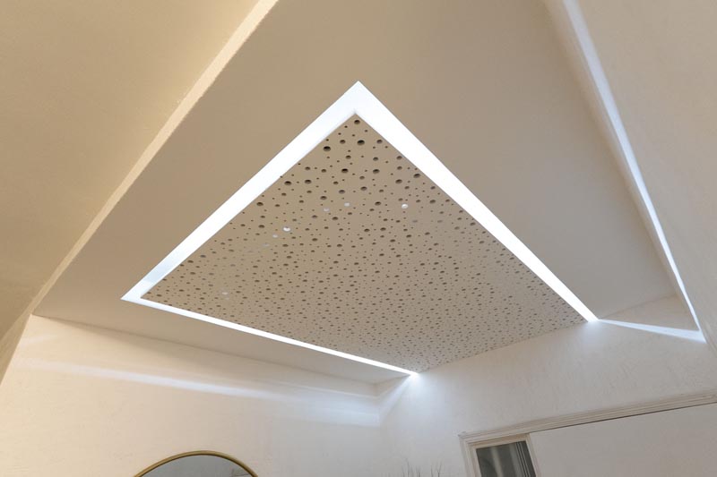 Geometric ceiling design with acoustic panel and LED border lighting in Houston renovation